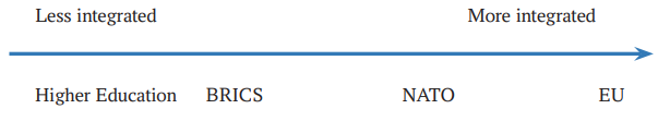 In line with our understanding integration can be defined as the development of common institutions and rules in different sectors by actors from various countries, which leads to a mutual dependence and preferentiality in mutual dealings. We hence consider the EU, NATO, BRICS and coordination among world-class universities in higher education to be integrative structures with varying levels of institutionalisation. The terms ‘integration in higher education’ and ‘world-class universities’ [6] are used interchangeably to refer to the fourth case, and designate the deep cooperation processes and implementation of common institutions that have created a mutual dependence between universities across the world.1 The study focuses on these four specific integrative structures, but the findings apply to other entities presenting similar characteristics.