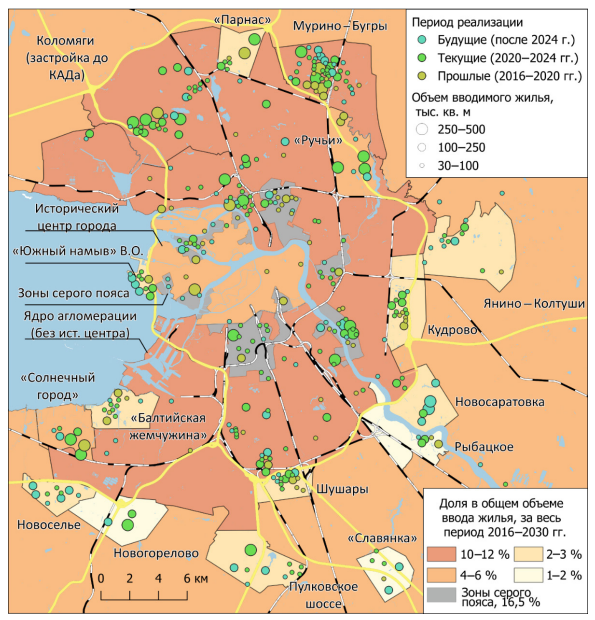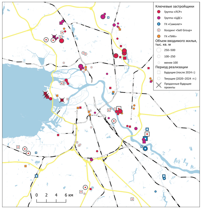 В конечном итоге радикальные антироссийские санкции и усиливаемый ими экономический кризис 2022 г., воздействуя на крупных девелоперов, влияют на пространственные особенности жилищного строительства в крупнейших городских агломерациях страны. Также кризис 2022 г. несет угрозы для достижения национальной цели развития России — «увеличение объема жилищного строительства не менее чем до 120 миллионов кв. метров в год»5 и «обеспечение граждан жильем общей площадью не менее 33 кв. метров на человека к 2030 году и не менее 38 кв. метров к 2036 году»6. На территории Санкт-Петербурга и Ленинградской области при этом с 2024 по 2030 г. должно возводиться около 6—7 млн м2 жилья ежегодно7, для чего необходимо освоение множества территорий в пригородной зоне Санкт-Петербургской агломерации [8].