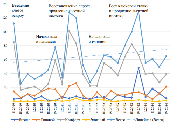 После частичного выхода из кризиса 2020 г. (снятие большинства ограничений в России и мире) со 2-го квартала 2021 г. начался рост уровня ключевой ставки: цены на квартиры стали дополнительно расти, а спрос на недвижимость — падать13. Соответственно, к моменту начала кризиса 2022 г. количество публикуемых застройщиками объявлений снизилось. В дальнейшем отрасль восстановилась, но в 2023 г. интенсивность застройщиков на рынке значительно возросла. В условиях роста разницы между ставкой по льготной ипотеке и ключевой ставкой появились сообщения о планах по прекращению «затянувшейся» льготной ипотеки, на что застройщики отреагировали стремительным выводом на рынки новых проектов. К 1-му кварталу 2024 г., когда стало окончательно ясно, что льготная ипотека не будет продлена, застройщики опубликовали малое количество объявлений. Небольшая активизация в 4-м квартале 2024 г. связана с сезонностью (вывод проектов в конце года под наибольший спрос) и попытками адаптаций к сложившимся условиями на рынке среди застройщиков.