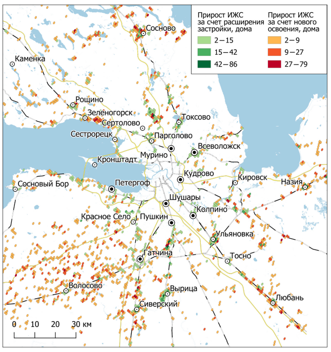 Для продолжения наращивания ввода ИЖС и при этом обеспечения его строительства в ближних пригородах необходим выход на рынок крупных девелоперов, которые смогут гарантировать необходимый уровень развития инфраструктуры в новых зонах застройки ИЖС45. В итоге кризис 2022 г., вызванный радикальными антироссийскими санкциями, может привести к развитию классической субурбанизации в пригородах Санкт-Петербургской агломерации и к существенным изменениям в системе расселения и транспортных потоках в агломерации.