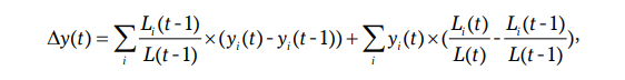 где y(t) — производительность труда; Δy(t) — прирост производительности труда; L(t) — численность занятых; i — сектор; t — год. Производительность труда определялась через соотношение валового регионального продукта (ВРП) и численности занятых. Для отдельных видов деятельности она рассчитывалась через соотношение валовой добавленной стоимости (ВДС) и численности занятых. Изменение методики определения видов деятельности (переход к ОКВЭД, затем к ОКВЭД2) потребовало отдельных расчетов по формуле (1) по периодам, когда действовала одна методика.
